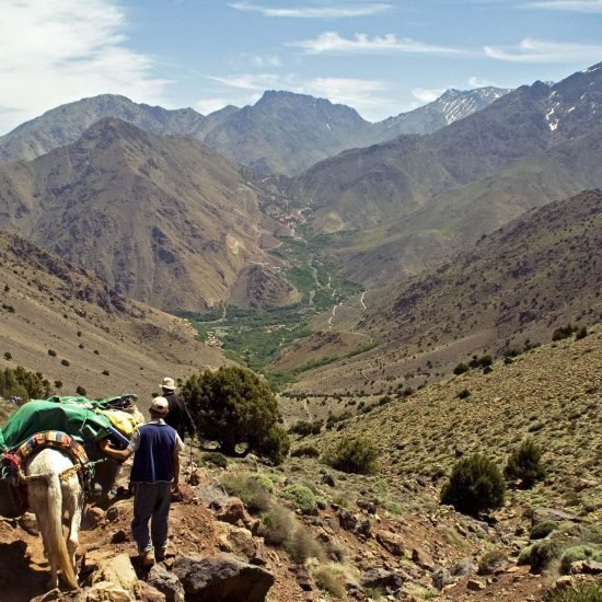 We leave Marrakech after breakfast and drive to Imlil via Asni. Imlil is the principal trailhead for walkers, and a busy market town. There is a constant movement of people coming down from the mountains, and an equal supply of activity from those about to embark on their adventure. We meet our mule team and once all our gear is loaded we begin walking along the valley towards Tacheddirt, some 8kms beyond Imlil. Soon the trail begins to rise as we climb up to the pass at Tizi n'Tamatert (2279m). We then descend to the pretty village of Ouaneskra and continue, for a further half-hour or so, to Tacheddirt (3000m), where we generally camp near the river.