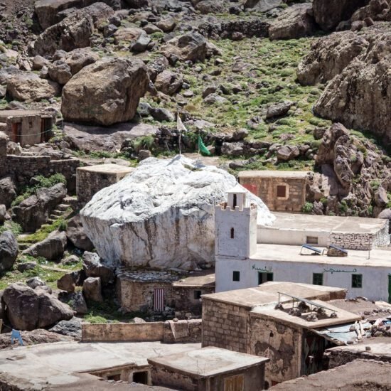 The shrine of Sidi Chamharouch itself, a sacred site for both locals and pilgrims, lies at an altitude of about 2,350 meters. Marked by a striking white-painted rock, it is dedicated to a legendary saint believed to offer spiritual healing. Non-Muslim visitors are not permitted inside the shrine, but the surrounding area provides a peaceful rest spot with panoramic views of the mountains. Small cafes and stalls along the trail sell mint tea and snacks, adding a touch of local hospitality to the trek. This moderate hike, typically completed in 4-6 hours round trip, combines spiritual mystique with awe-inspiring alpine scenery, making it an essential excursion for those exploring Morocco’s High Atlas region.